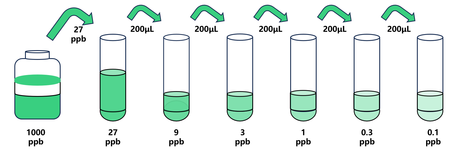 試劑盒中取出標(biāo)準(zhǔn)品,準(zhǔn)備7個試管,先將1000ppb標(biāo)準(zhǔn)品(200µL)按需吸取一定量用1×稀釋液稀釋至27ppb(例:27µL的標(biāo)準(zhǔn)品母液+973µL的1×稀釋液,制備得到1000μL的27ppb濃度標(biāo)準(zhǔn)品),隨后在5個試管中分別加入400μL的1×稀釋液,在這5個單獨的試管中將27ppb標(biāo)準(zhǔn)品依次3倍倍比稀釋至5個梯度,共配制6個濃度的標(biāo)準(zhǔn)品,依次為:27ppb、9ppb、3ppb、1ppb、0.3ppb、0.1ppb,從最高濃度標(biāo)準(zhǔn)品溶液中吸取200μL標(biāo)準(zhǔn)品到下一個試管中,輕輕吹打混勻,以此類推進行標(biāo)準(zhǔn)品的倍比稀釋(如圖所示),1×稀釋液用作零濃度標(biāo)準(zhǔn)品(0ppb)。