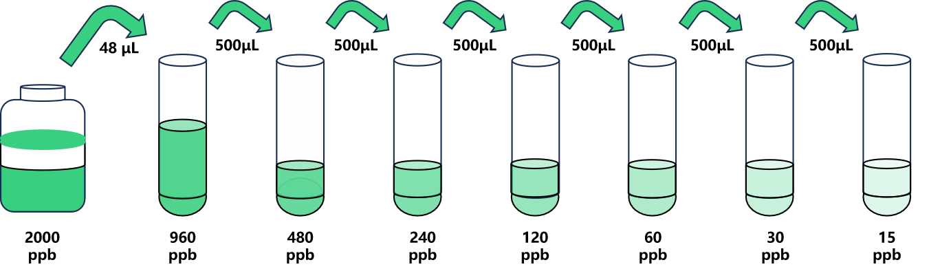 試劑盒中取出標(biāo)準(zhǔn)品,準(zhǔn)備7個(gè)試管,先將20000 ppb標(biāo)準(zhǔn)品(200µL)按需吸取一定量用1×稀釋液稀釋至960 ppb(例:48µL的標(biāo)準(zhǔn)品母液+952µL的1×稀釋液,制備得到1000μL的960 ppb濃度標(biāo)準(zhǔn)品),隨后在6個(gè)試管中分別加入500μL的1×稀釋液,在這6個(gè)單獨(dú)的試管中將960 ppb標(biāo)準(zhǔn)品依次2倍倍比稀釋至7個(gè)梯度,共配制7個(gè)濃度的標(biāo)準(zhǔn)品,依次為:960 ppb、480 ppb、240 ppb、120 ppb、60 ppb、30 ppb、15 ppb,從最高濃度標(biāo)準(zhǔn)品溶液中吸取500μL標(biāo)準(zhǔn)品到下一個(gè)試管中,輕輕吹打混勻,以此類推進(jìn)行標(biāo)準(zhǔn)品的倍比稀釋(如圖所示),1×稀釋液用作零濃度標(biāo)準(zhǔn)品(0ppb)。